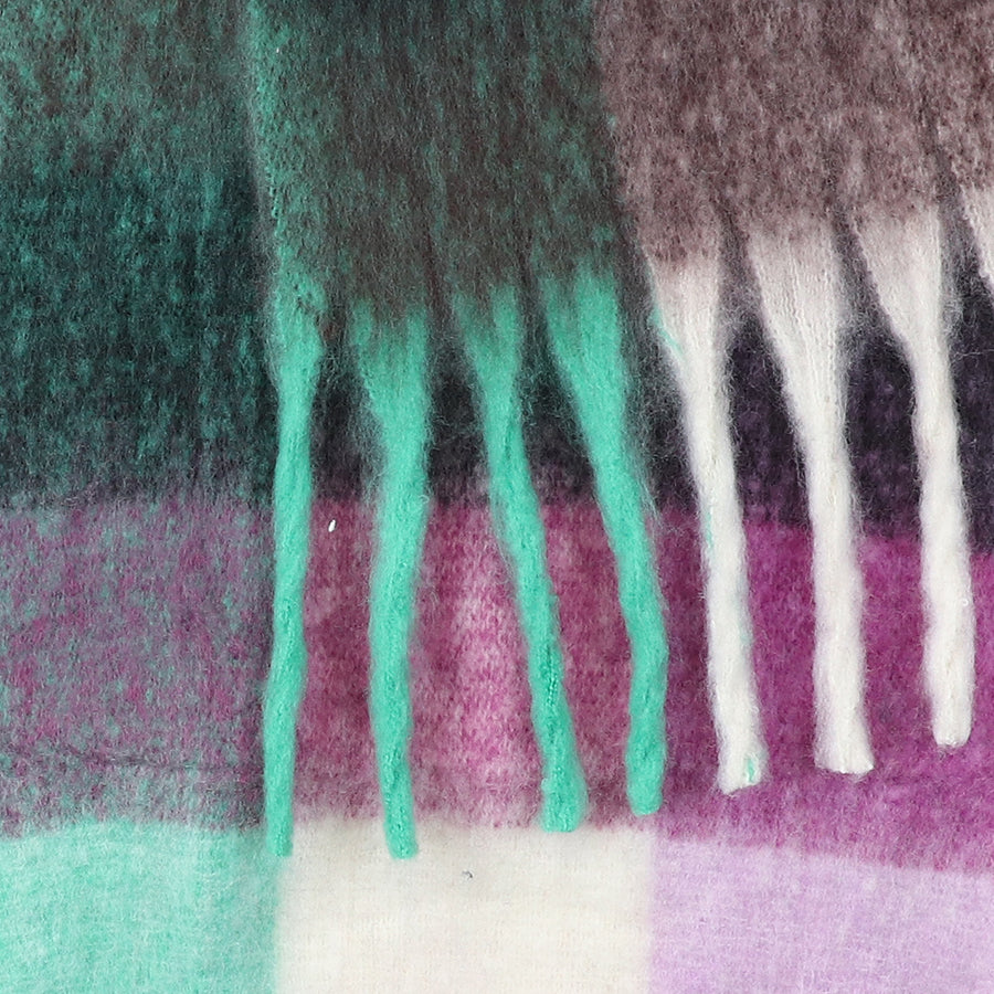 Purple, lilac, green and white mix fluffy winter check scarf with tassels