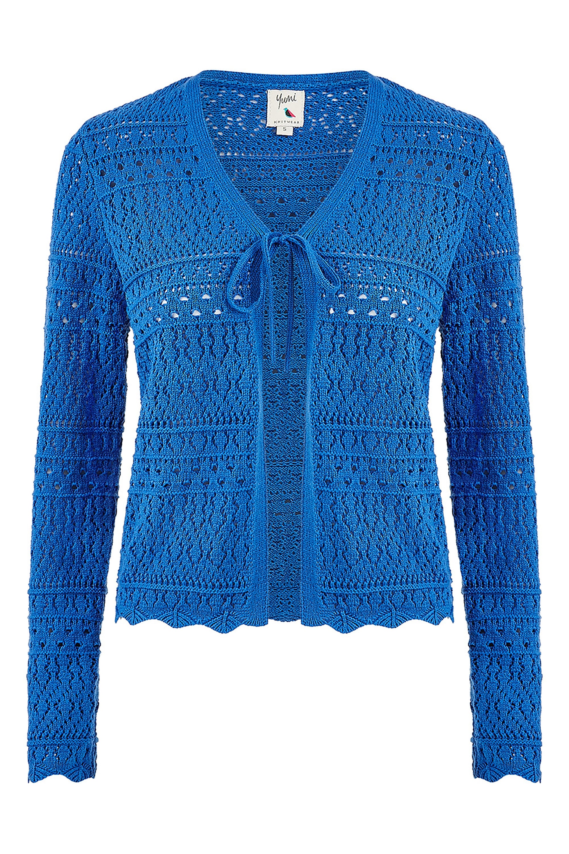 In a super cute and bang on trend crochet knit, this little cardigan will see you through the spring. With a tie front fastening, long sleeves and a hip length fit - It's a super versatile little number that can be worn with anything to keep the chill off.